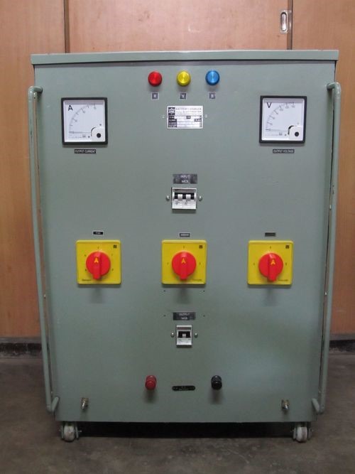 VTC Battery Charger are generally air cooled type portable & designed for dusty & humid climate at site Railway Station, outdoor installation etc. Main transformer of the chargers are wound with copper wire / Strips. CRGO core is used for magnetic circuit of the chargers. The charger mainly consist of Input ‘ON ‘OFF Switch, Input Fuse, Input ON Indicator, Rotary Switches with regulating transformer with main step up/step down transformer, silicon diode, rectification from AC-DC Ballast choke & output terminal. The output supply consist of surge separation circuit and whole storage condenser.