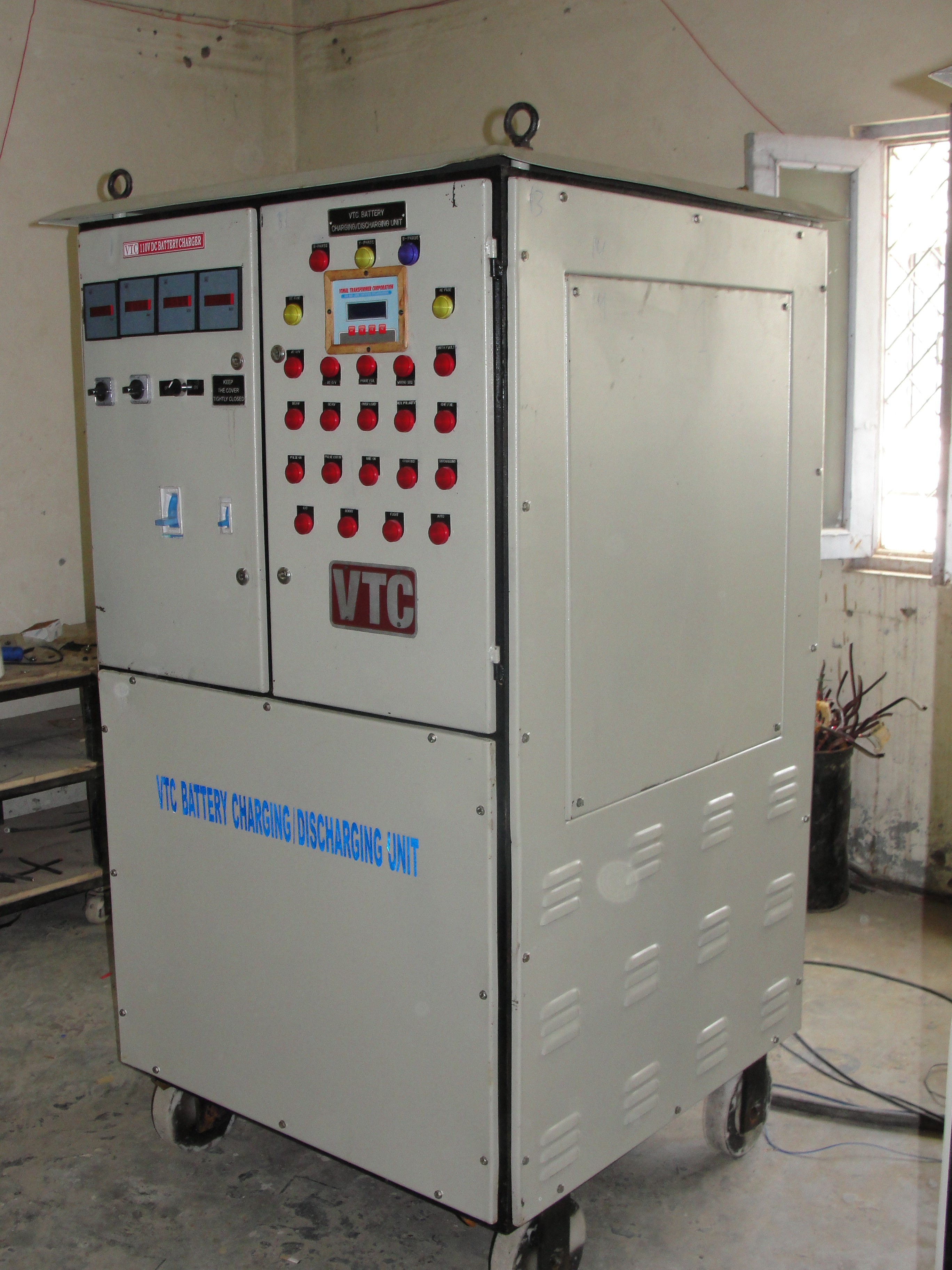 VTC is an energy efficient charger cum discharger for lead acid batteries. During discharging, energy is fed back to main power line instead of wasting it as heat. It features Audio Visual annunciations for operation and faults. It has multi function LCD for programming and displaying working status. All parameters are adjustable within limits, to prevent damage to batteries by entering out of range values. facility incorporated in the equipment immensely reduces energy bill in case of VRLA battery manufacturing either in constant voltage or in constant current mode. The batteries may be discharged in constant current mode. The discharge energy is re-generated back to the mains. The power factor during charging is high because of symmetrical phase-placement of the charging channels.